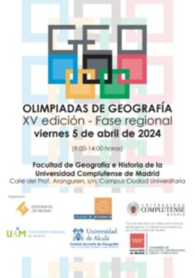 El Colegio de Geógrafos convoca la XV Olimpiada de Geografía de España, a desarrollar en dos fases: la fase local tendrá lugar el viernes 5 de abril de 2024, de forma presencial, en la Facultad de Geografía e Historia de la Universidad Complutense de Madrid, y la estatal se celebrará los días 3 y 4 de mayo de 2024 en Sevilla.